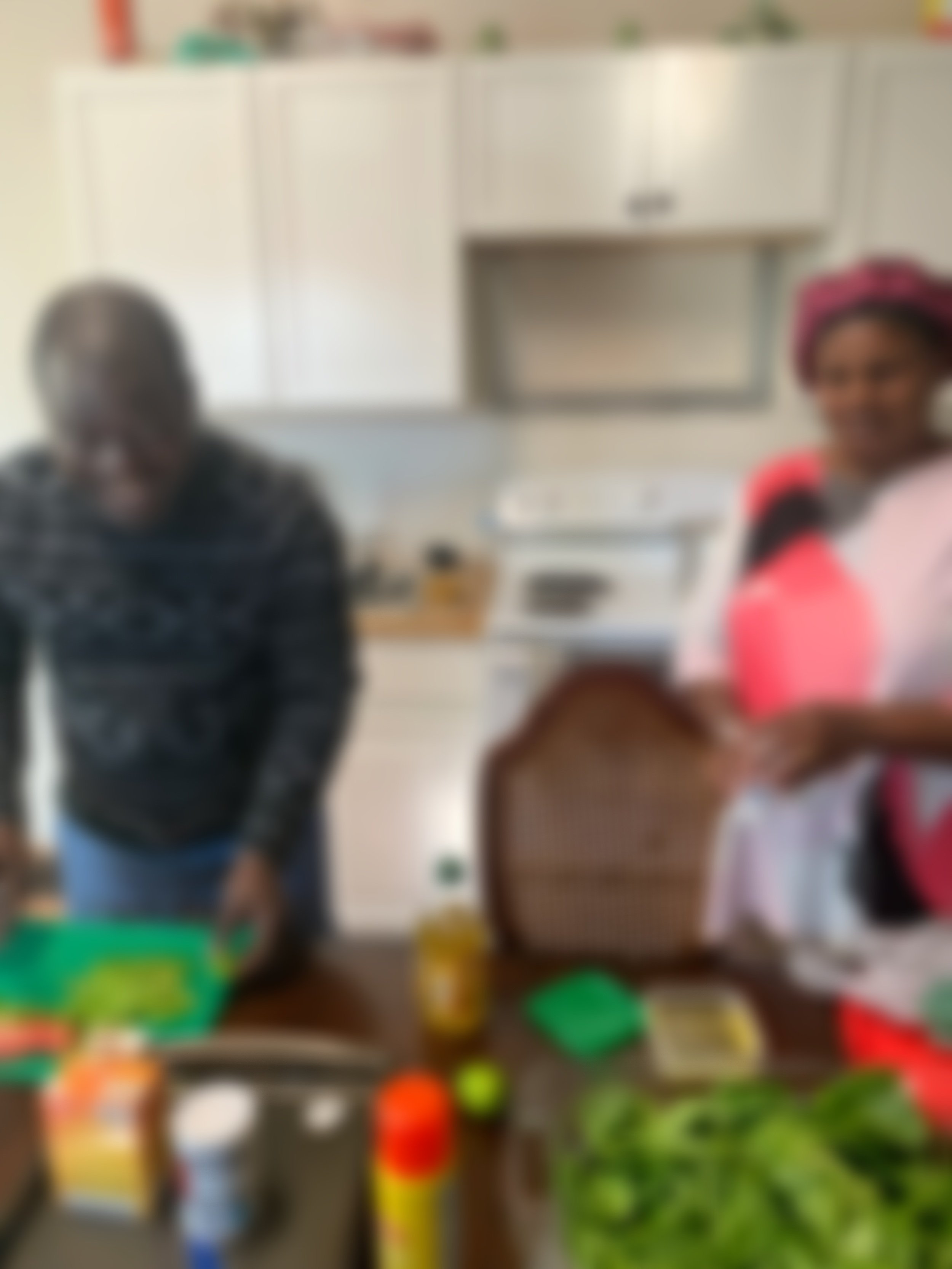 Mom and dad enjoy a cooking lesson on making salad and roasting a chicken in the oven. Having an oven is a new experience for the family.